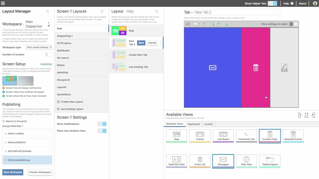 The dispatching product I work on is intended to be used across multiple screens at once. In order to promote consistency in the workspaces used by an agency's users, we developed a tool called Layout Manager. The tool allows multiple layouts to be created for each screen, with tabs consisting of what we called views. This gave agencies the opportunity to create different workspace configurations for each role type, and ensures that the information users are trained to find is always in the correct location.